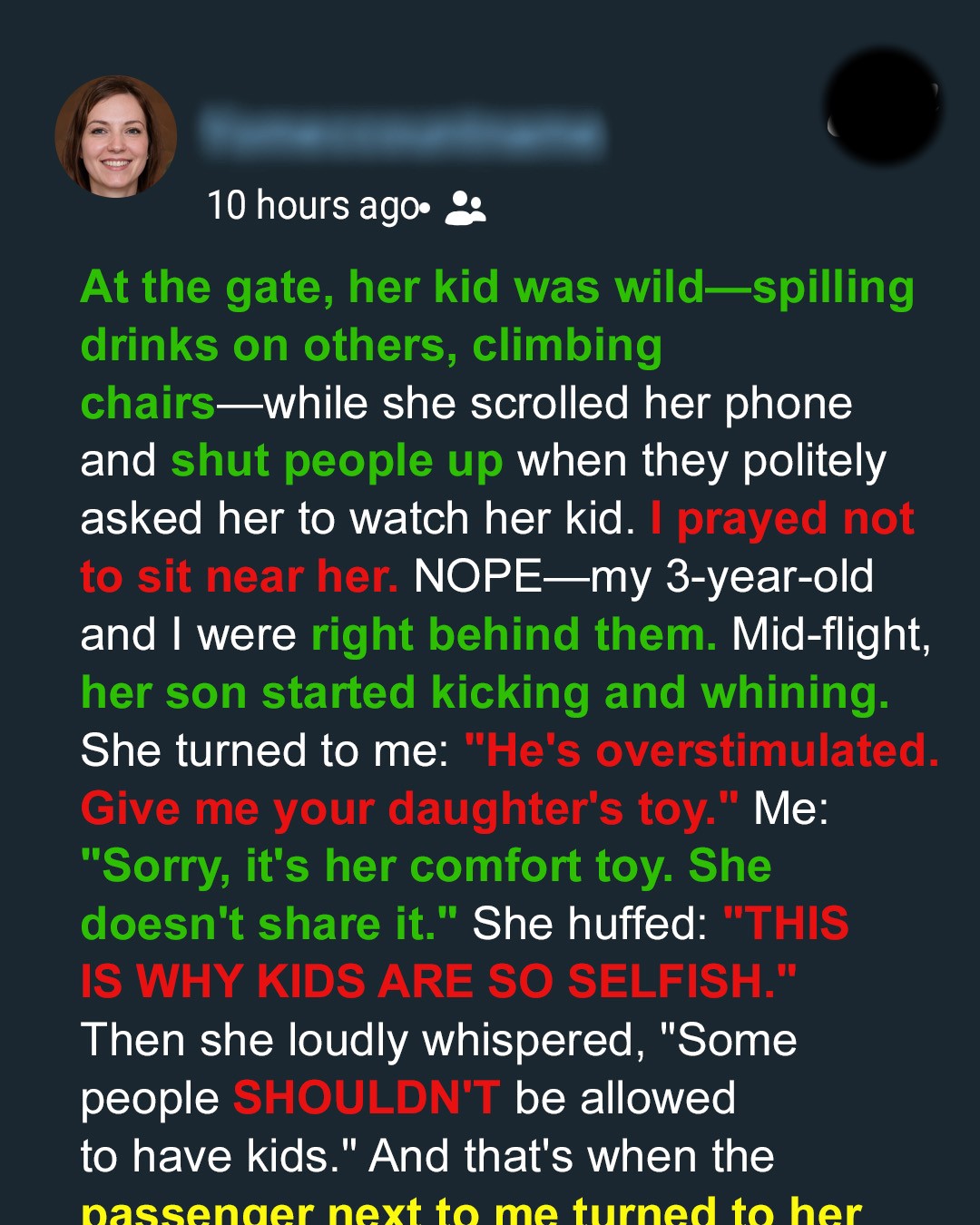 Her son, maybe five or six, was everywhere. He was running laps between rows, climbing on the chairs, kicking people’s carry-ons. He knocked over a stranger’s drink and barely missed tripping an elderly man.The boy shrieked, laughed, and darted past everyone like it was a playground.And she? The mother?