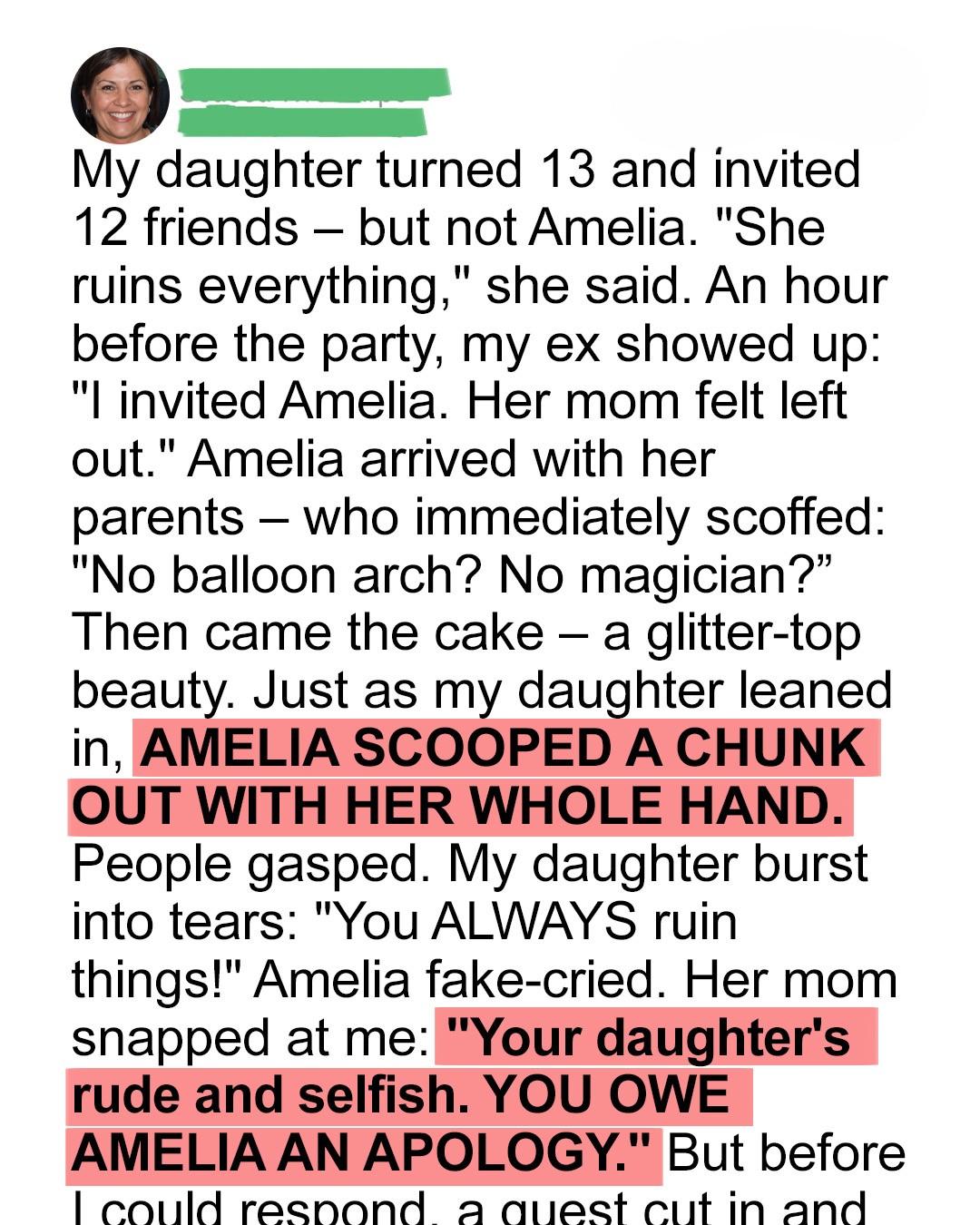 “Are you serious right now?” I finally managed to say. “Your daughter just grabbed a handful of my daughter’s birthday cake and ruined it, and you want me to apologize?”