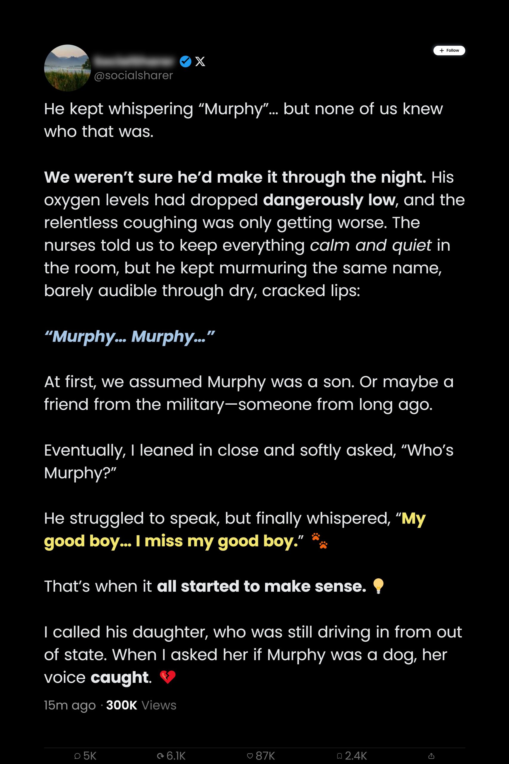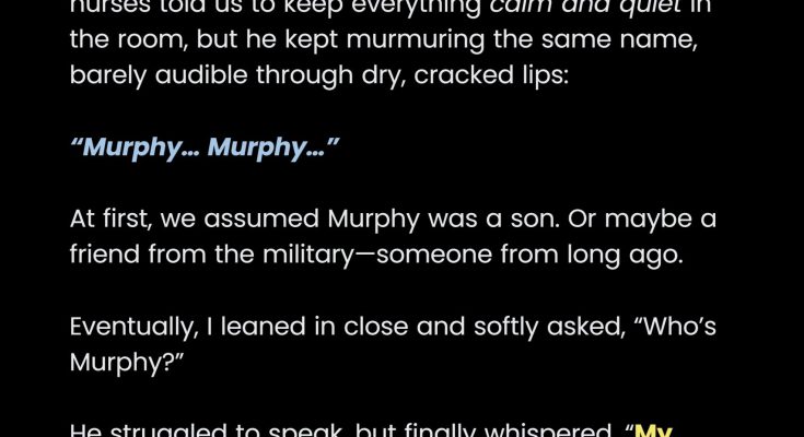 His oxygen levels were dangerously low, and his coughing had grown violent.The nurses asked us to keep the room quiet and peaceful, but the old man kept repeating the same word through dry, cracked lips: “Murphy… Murphy…”At first, we thought it might be a person—maybe a son or an old war buddy. I leaned in and gently asked who Murphy was.