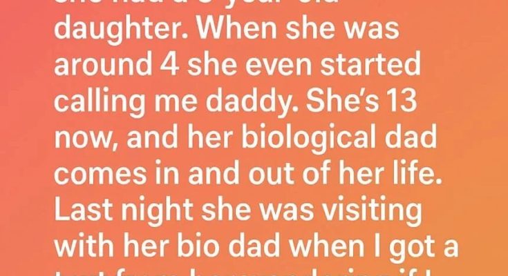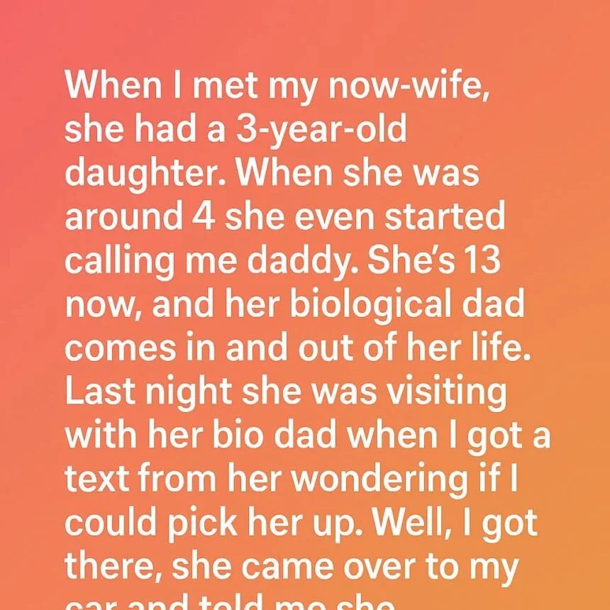 When I met my now-wife, she already had a 3-year-old daughter, and by the time she turned four, she started calling me “Daddy.”Now she’s 13, and her biological father drifts in and out of her life without consistency. Last night, while she was visiting him, she sent me a quiet text asking if I could pick her up. When I arrived, she walked to my car with her hood low and her backpack tightly held.