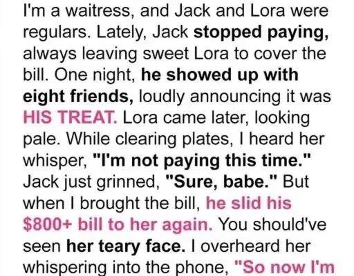 I’ve been a waitress at a fancy downtown restaurant for ten years, but nothing shocked me like the night Jack strutted in with eight rowdy friends and expected his wife, Lora, to cover their $800+ bill. They used to be a sweet couple. Now, Jack indulged in lavish meals, and Lora paid every time, her face more strained each visit.
