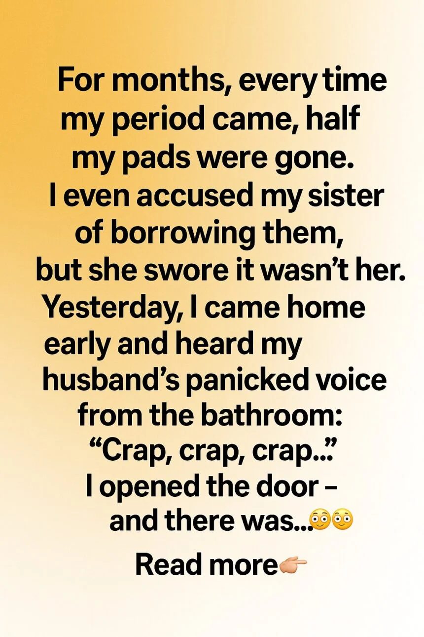 For months, every time my period came, half my pads were gone. I even accused my sister of borrowing them, but she swore it wasn’t her. Yesterday, I came home early and heard my husband’s panicked voice from the bathroom: “Crap, crap, crap…”