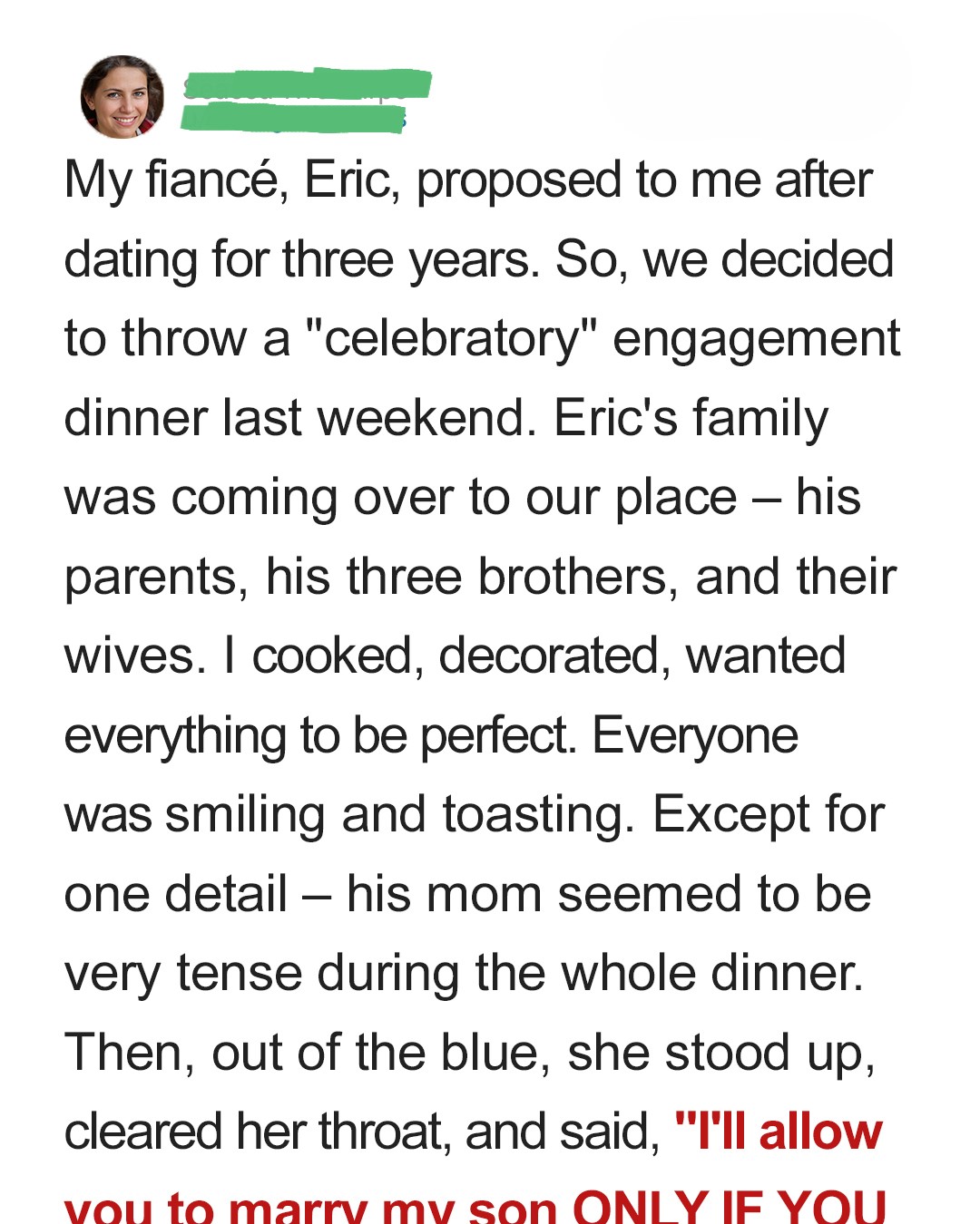 However, only one person, my fiancé’s mom, Martha, appeared quite tense the whole time. I should have known that would mean something, because right after dessert, she suddenly stood up!