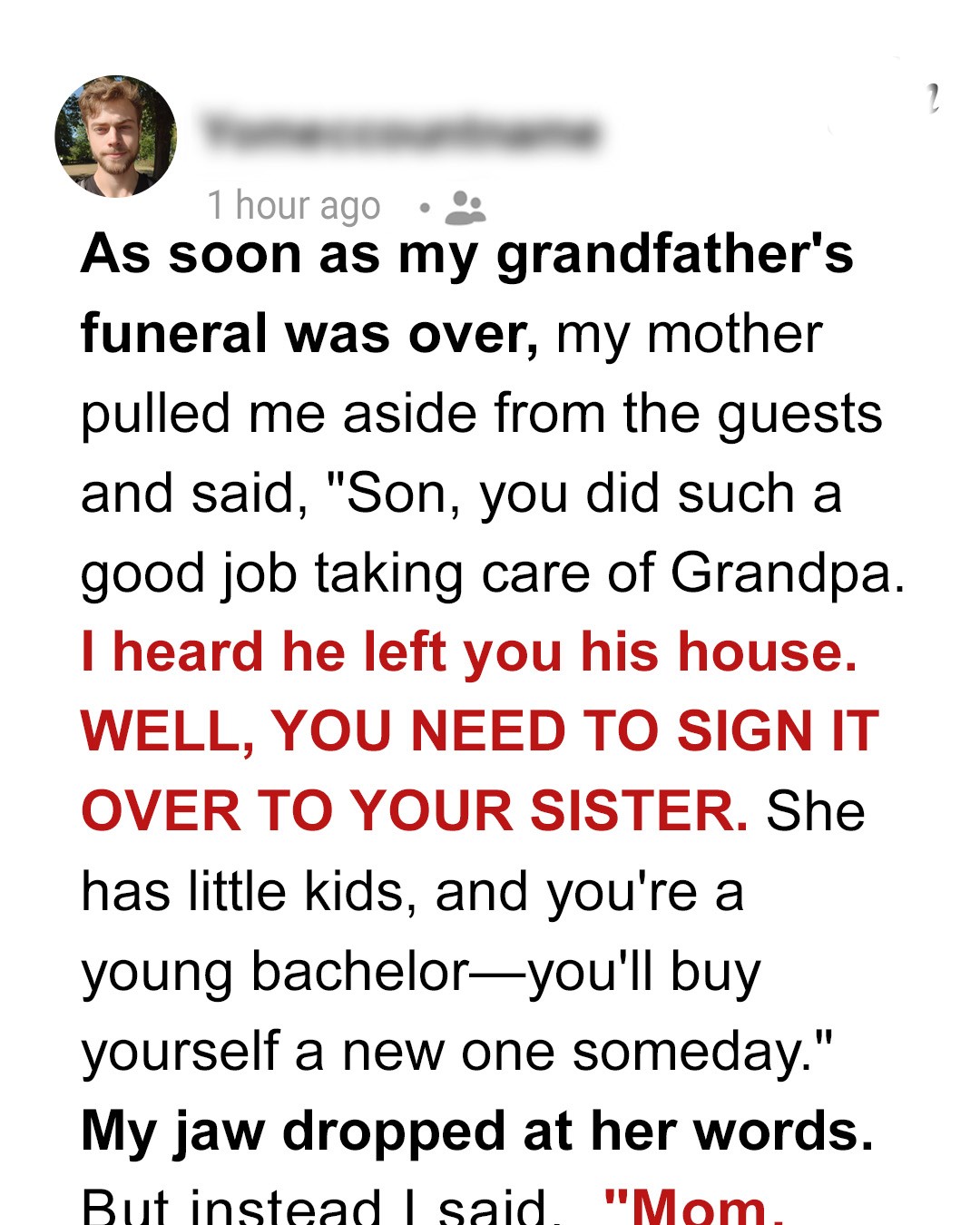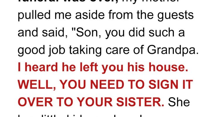 “You did such a good job taking care of Grandpa, son,” she said, brushing something invisible from her silk sleeve. “I heard he left you the house. That was… generous.”
