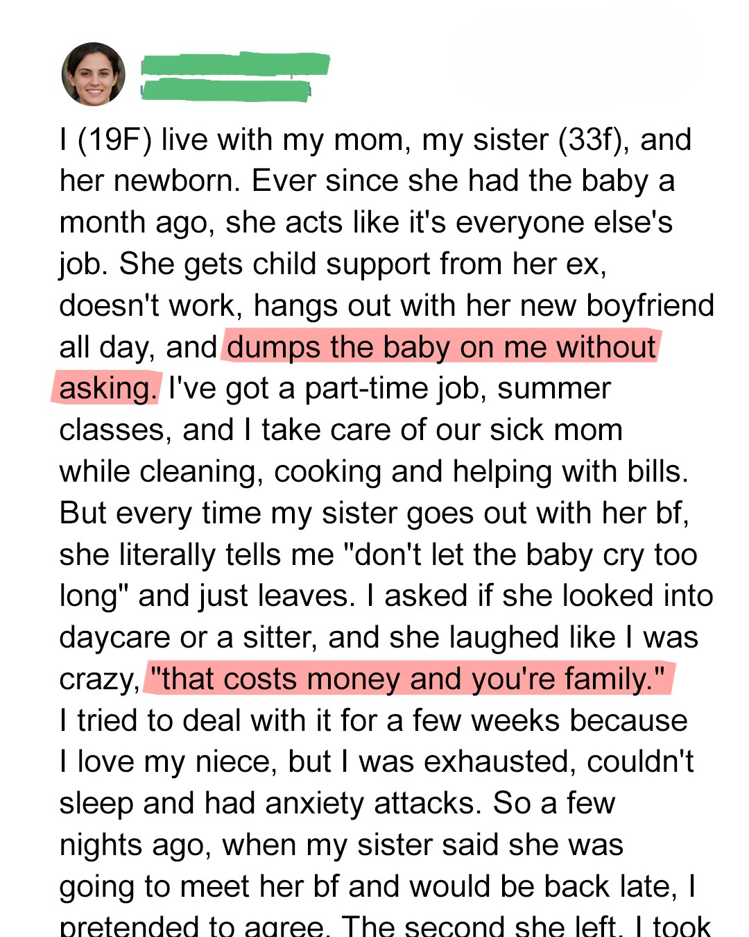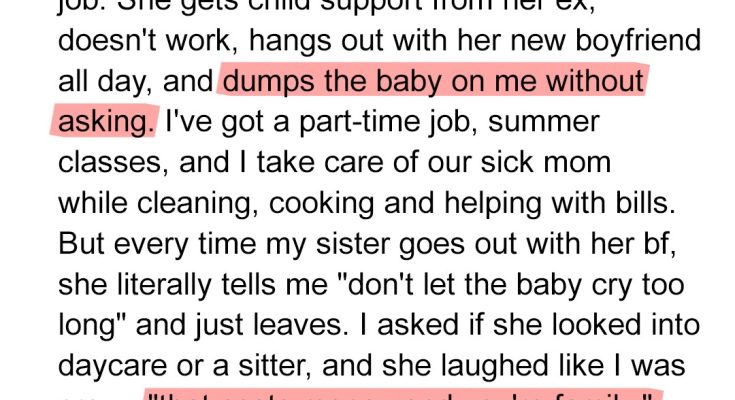 My sister, Abby, is 32, single, and lately acting like she’s 20 and child-free. She had Rosie with a man who vanished the moment the second line showed up. Since then, she moved back into our family’s house and let the rest of us pick up the slack.She says she gets child support but I haven’t seen it.I work part-time at a bookstore, I do online classes for nursing, and I take care of our mom, who’s been in and out of treatment for a respiratory illness for nearly a year now.
