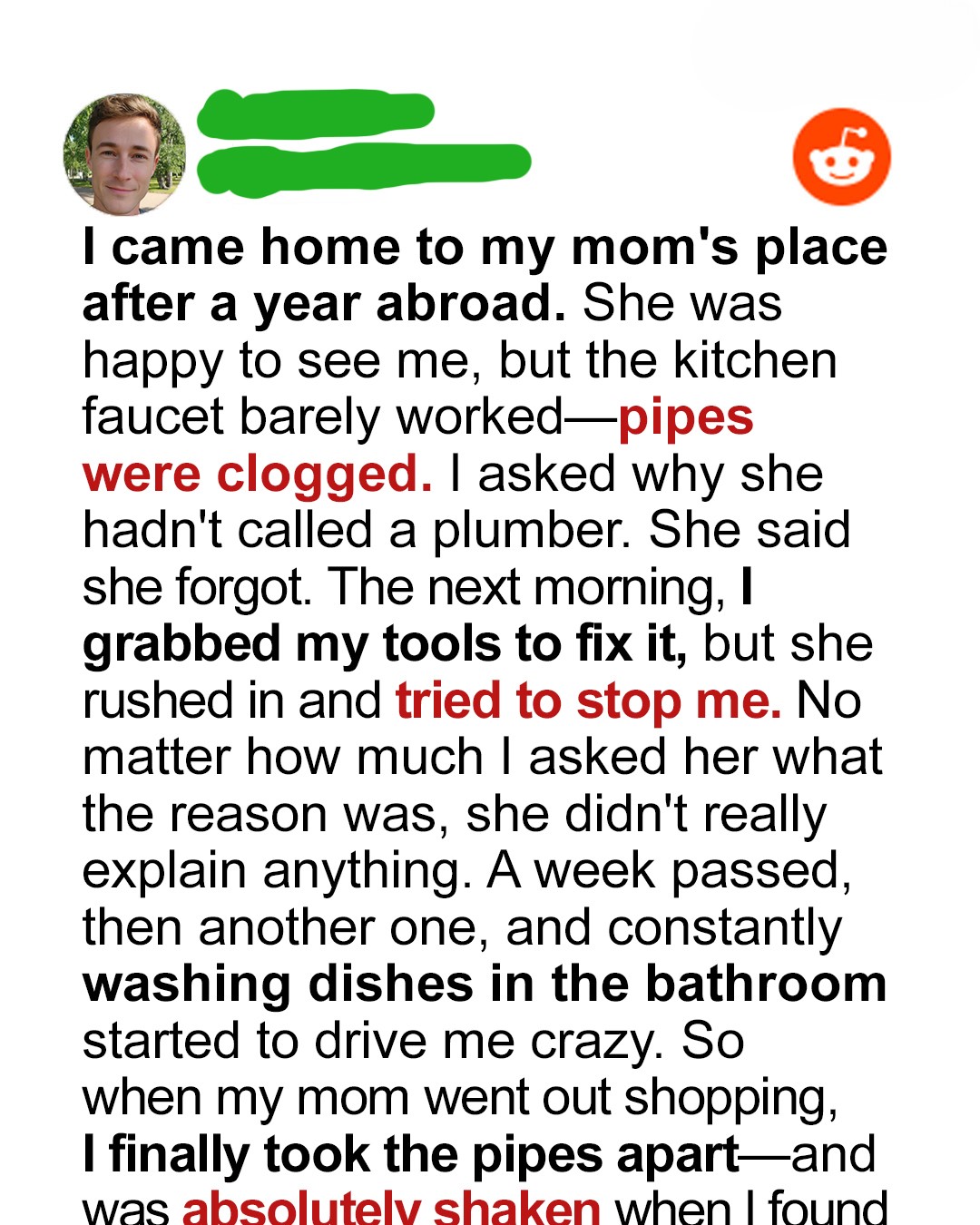 After a year abroad, I came home expecting hugs and Mom’s delicious food. What I didn’t expect was a clogged sink in our kitchen. I offered to fix it but Mom panicked and stopped me. When I opened those pipes while she was out, I uncovered a chilling truth she’d been hiding for years.
