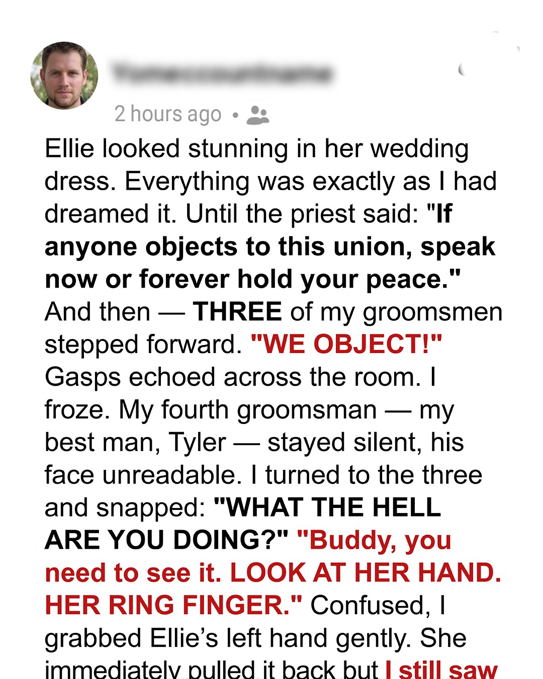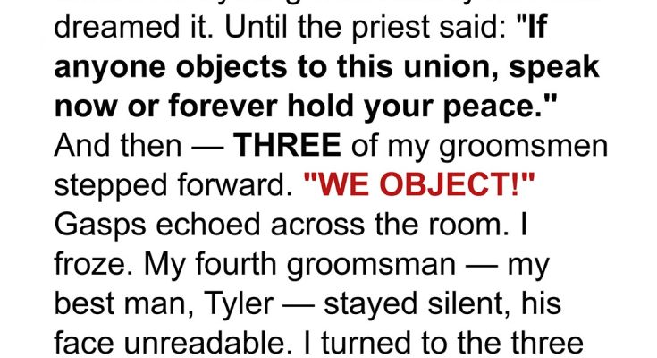 On the day I was meant to say “I do,” three of my groomsmen stood up to object in front of everyone. I thought it was a prank… until they told me to look at her hand. What I saw changed everything — and the one person who stayed silent? That hurt worst of all.I was standing at the altar, ready to marry the love of my life, when everything went to hell.