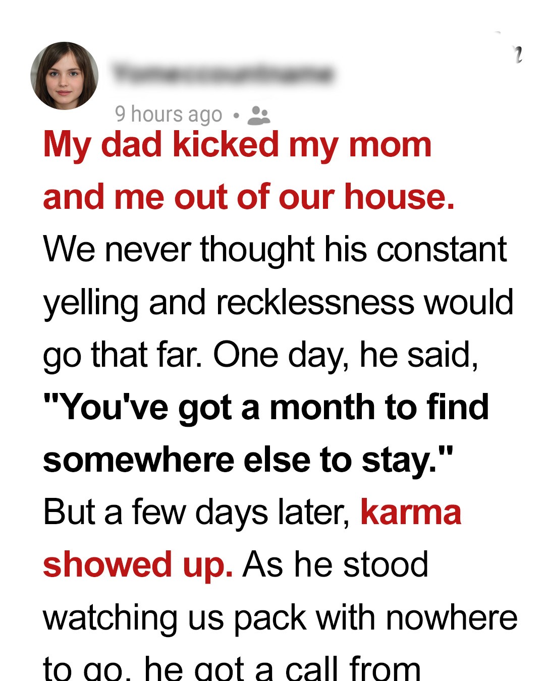 When my dad told us to pack our things and leave, I thought he was bluffing. He wasn’t. But just when it felt like we’d lost everything, life flipped the script in the most unexpected way.My dad was always the loudest voice in the room, and the coldest one at home. My mom and I had learned to live around his moods — until the day he decided we didn’t belong anymore. We had no idea that someone else had been watching all along, and they were about to change everything.