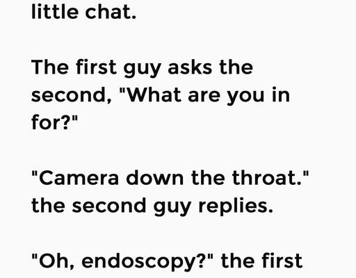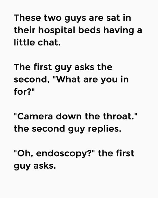 These two guys are sat in their hospital beds having a little chat. The first guy asks the second, “What are you in for?”“Camera down the throat.” the second guy replies. “Oh, endoscopy?” the first guy asks.The second guy says, “Yeah. Checking for stomach cancer. How about you?”
