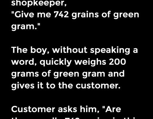Youngster replies, “Of course, you can go home and count. My dad has counted and established that each kilo of green gram comprises of 3710 grains.Therefore, for 200 grams, it should contain 742 grains.”Customer gets even more curious and asks the youngster, “What does your dad do?”