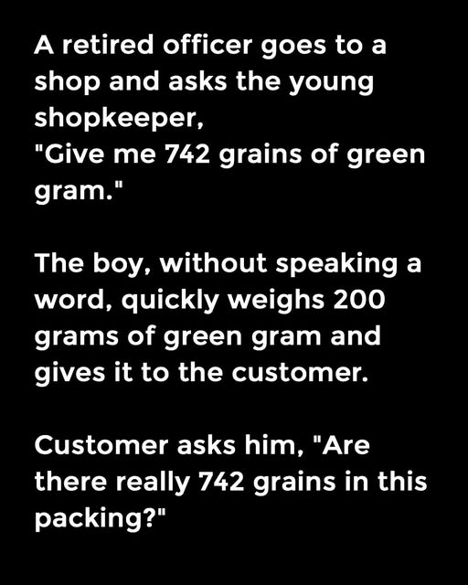 A retired officer goes to a shop and asks the young shopkeeper,“Give me 742 grains of green gram.”The boy, without speaking a word, quickly weighs 200 grams of green gram and gives it to the customer. Customer asks him, “Are there really 742 grains in this packing?”