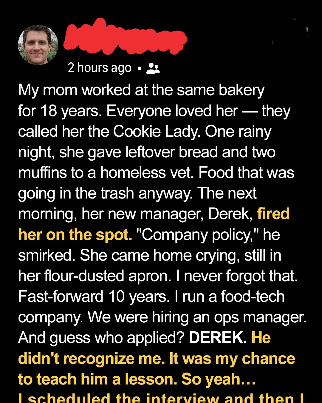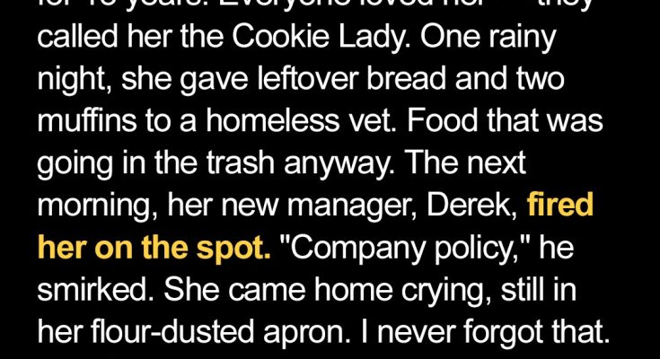 When my mom was fired for showing kindness to a homeless vet, I was just a powerless bystander. Ten years later, I got the chance to show her that doing the right thing still matters — and karma doesn’t forget.I’m Kevin, thirty-five, born and raised in the same rust-belt town where you can smell the bakery on Main Street before you even see it. I run a mid-sized food-tech company now, live in a rented loft with creaky floors and terrible parking, and I still call my mom every Sunday like clockwork.