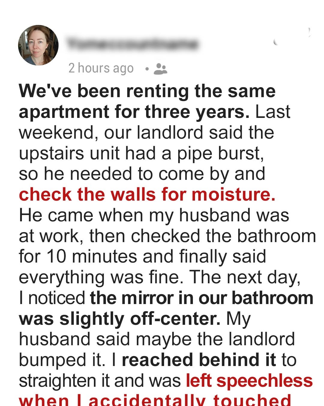 When a routine visit from their landlord turns quietly unsettling, Hannah begins to unravel a hidden breach of trust buried within the walls of her home. As her husband’s career teeters on the edge, they uncover a truth that shatters their sense of safety… and reveals just how far ambition can reach.We had been renting that apartment for three years.It wasn’t anything extraordinary, just two bedrooms, beige walls, popcorn ceilings, and that faint smell of old paint that never quite went away.But it was ours.