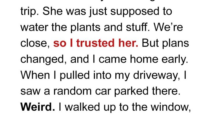 I left for a month-long work trip, trusting my neighbor and friend to watch my house. But when I returned early, I found a strange car in the driveway… and a family of strangers eating dinner in my kitchen!The air smelled like late summer — warm pavement and cut grass — as I handed Lisa my house keys.“Just the usual,” I said with a tired smile, heaving my luggage into the trunk with a solid thunk. “Water the indoor plants and the garden, maybe check the mail.”