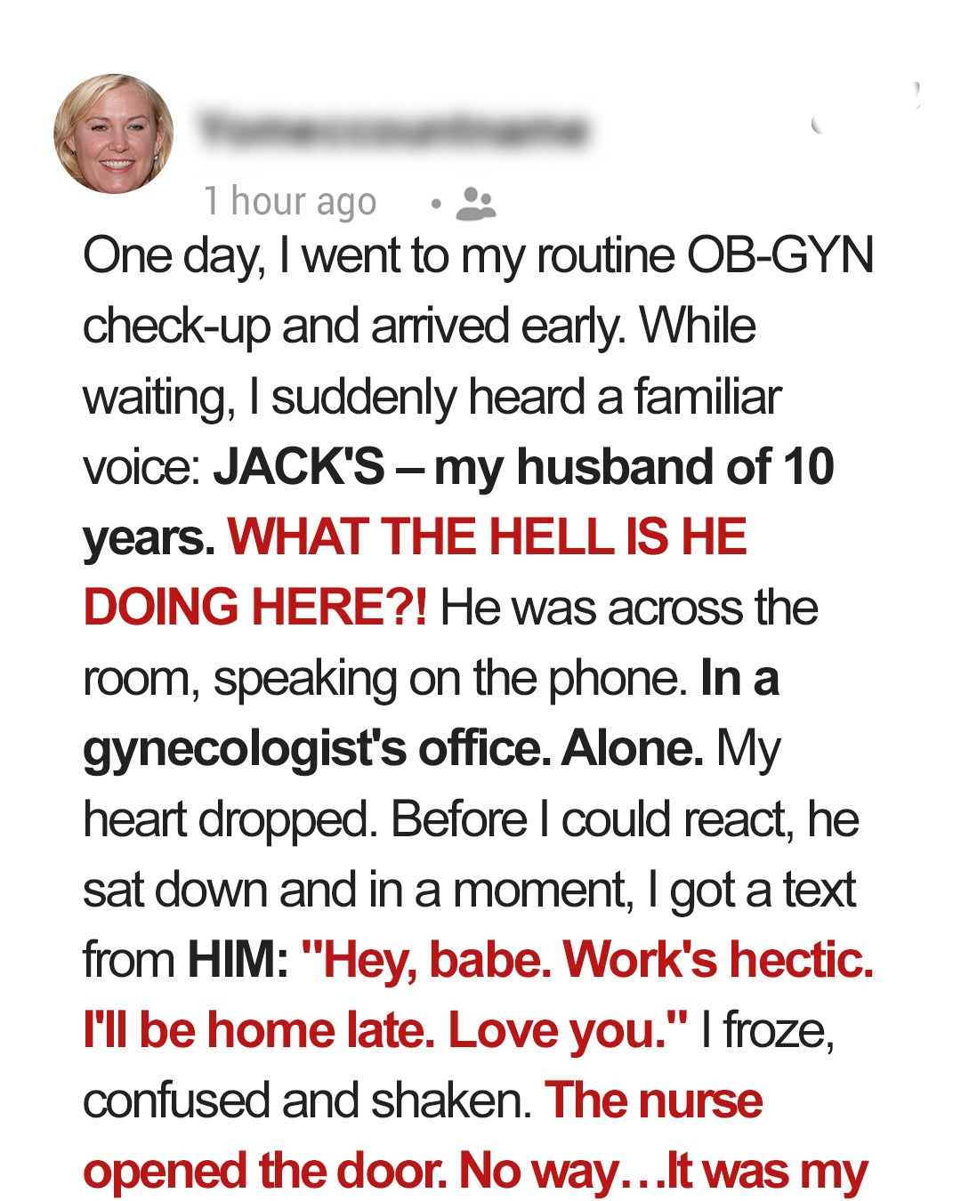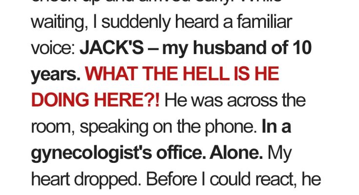 I was sitting in the hospital’s waiting room, waiting for my annual checkup with my OB-GYN, when I heard a familiar voice. A man was talking quietly on his phone just a few seats away, and my heart nearly stopped when I looked at him. It was my husband, Jack. What was he doing there?The room suddenly felt smaller. My mind raced with questions I didn’t want to ask. Questions that could destroy everything I thought I knew about my marriage.