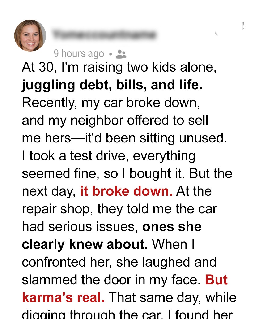 You know that moment when life kicks you while you’re already down? My scheming neighbor thought she could pull a fast one on a broke single mom like me. She tricked me into buying her busted car and figured she’d pocket my hard-earned money. But the universe had other plans.Three years ago, my world crumbled when my husband Dan died in that terrible accident on Highway 52. One minute I was a happy wife planning our kids’ summer vacation, the next I was a 30-year-old widow drowning in bills and heartbreak.