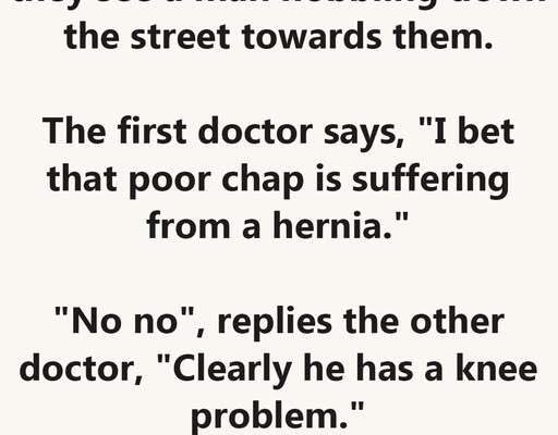 Two doctors are in front of their clinic about to go in when they see a man hobbling down the street towards them. The first doctor says, “I bet that poor chap is suffering from a hernia.”