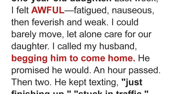 “Hey, babe,” he said, distracted. I could hear voices in the background. He was at work.“Ryan,” I whispered, throat dry. “I feel awful. I need you to come home.”He hesitated. “What’s going on?”“I can’t take care of Lily,” I said. “I can’t even sit up. Please.”He sighed. “Alright, I’ll finish up here and head out soon.”“How soon?”“Give me, like, twenty minutes,” he said. “I just need to wrap something up.”