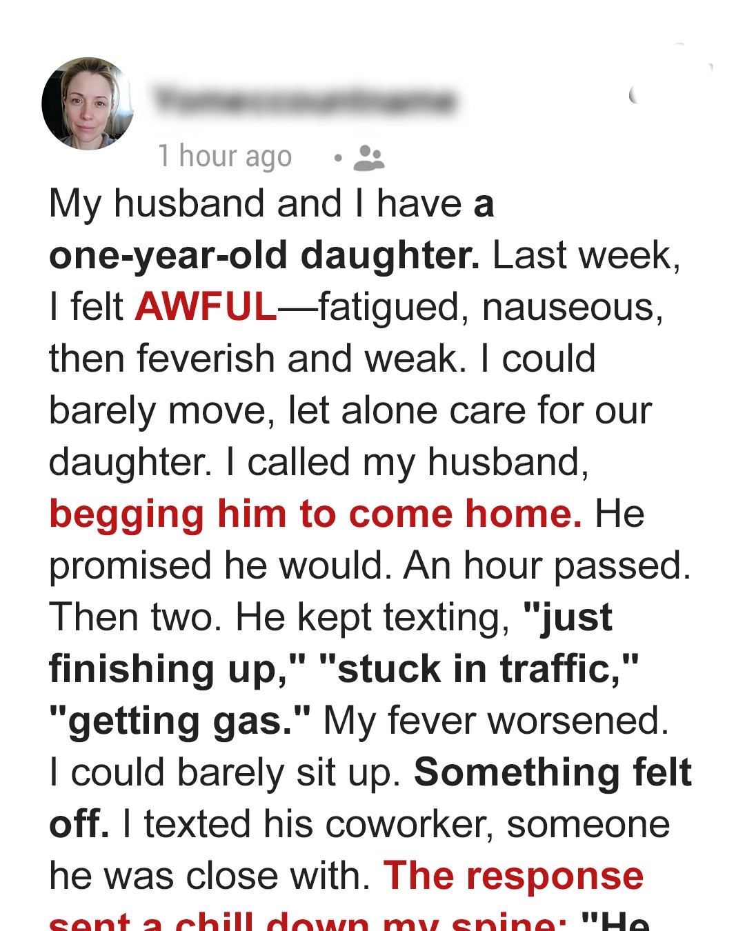 Burning with fever and too weak to stand, I begged my husband to come home and help me with our baby. He kept insisting he was on his way, but when I reached out to his coworker, the truth left me shaken.I never thought I’d end up like this. Lying in bed, burning up with fever, barely able to lift my head. My body felt like it wasn’t mine anymore—weak, shaky, useless.