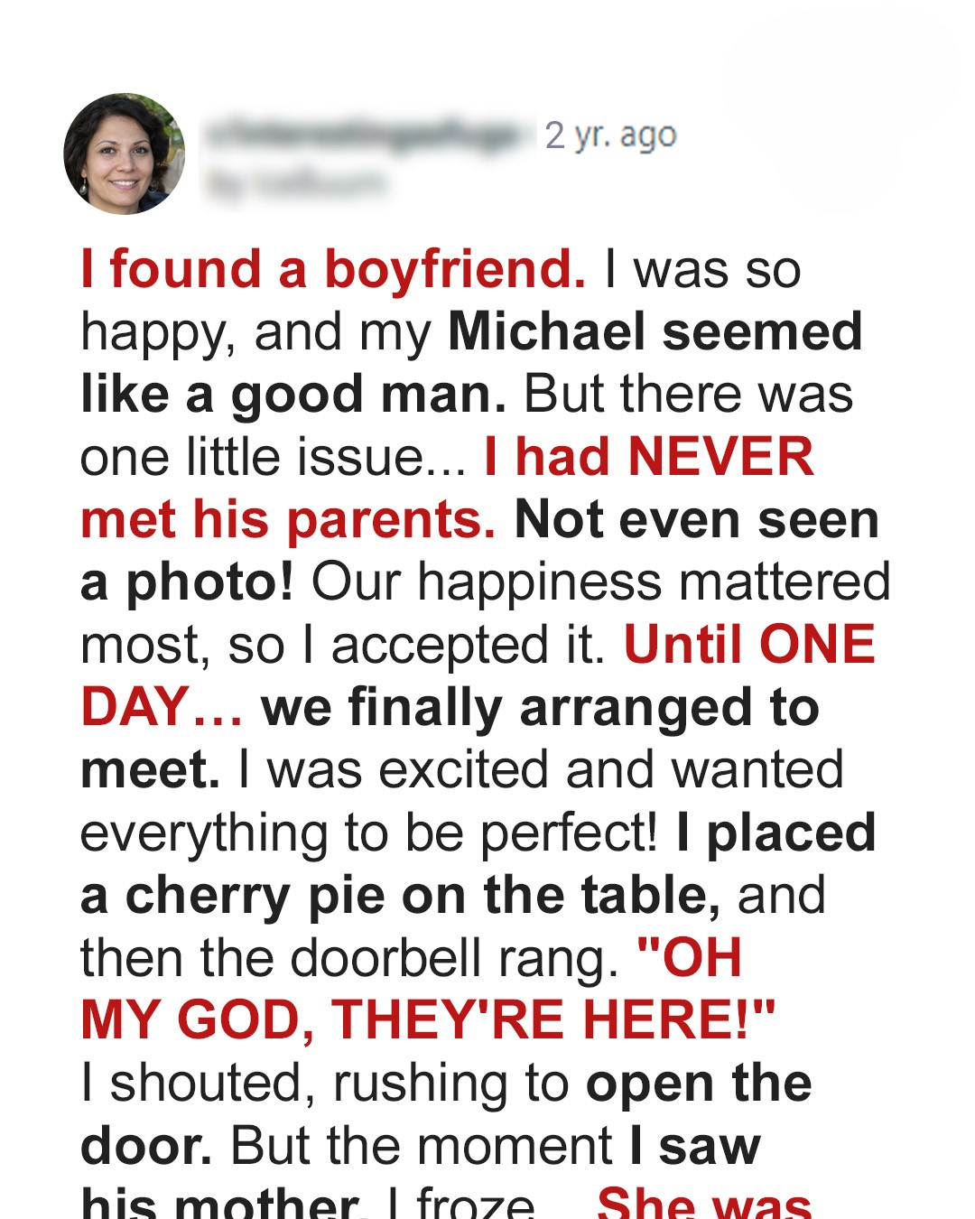 Things between us were serious, we both knew this was the real thing. We had talked about the future, and it was clear we saw it together. Probably for life.Still, he refused to introduce me to his family. The only relative of his I had ever met was his cousin Josh and that only happened because we ran into him on the street.It was strange, because everyone in his family clearly knew about me. They even sent us joint holiday cards. And yet Michael kept putting off any actual introductions.