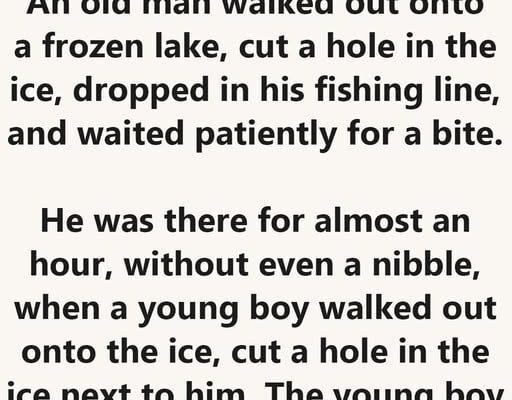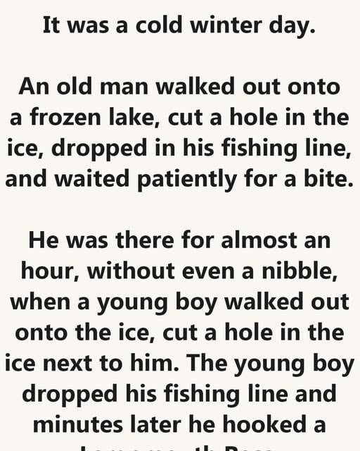 It was a cold winter day. An old man walked out onto a frozen lake, cut a hole in the ice, dropped in his fishing line, and waited patiently for a bite. He was there for almost an hour, without even a nibble, when a young boy walked out onto the ice, cut a hole in the ice next to him.