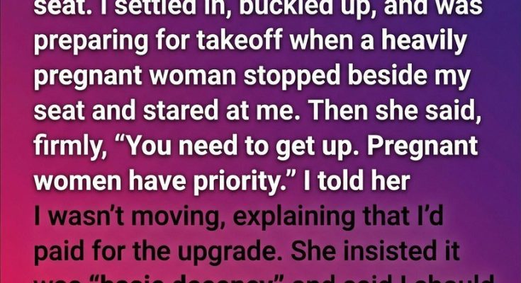 He fastened his seatbelt, tucked his bag away, and exhaled, ready to drift into the hum of travel. That was when he noticed a woman standing beside him, one hand resting protectively on her noticeably pregnant belly, the other gripping the seat in front of her for balance. She looked tired but determined, her voice gentle at first.