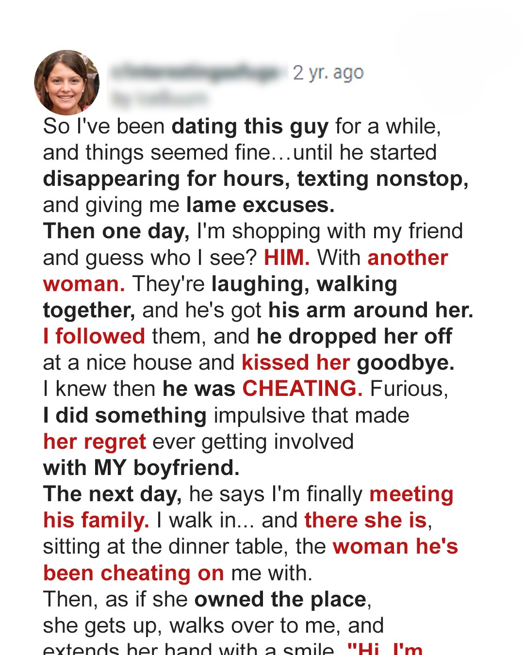 I was convinced my boyfriend was hiding something, so I followed him and caught him with another woman. I confronted her, thinking that was the end of it. But when she arrived at our family dinner, acting like she belonged, everything I thought I knew began to unravel.Why are men so afraid of introducing their girlfriends to their families? The obvious answer would be that they just do not take the relationship seriously. But that was not the case with Michael and me.