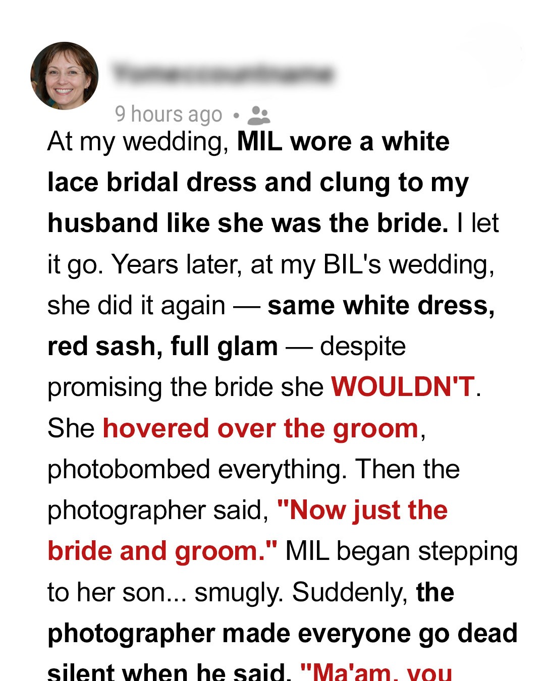 At my wedding, my MIL wore a white lace gown and clung to my groom like she was the bride. I let it go. Years later, she promised not to repeat the stunt at my BIL’s wedding, but showed up in the same dress! This time, a sharp-tongued photographer saw through the act… and shut her down.I have only one photo from my wedding: a carefully cropped and professionally edited picture of my husband and me standing in front of the church.