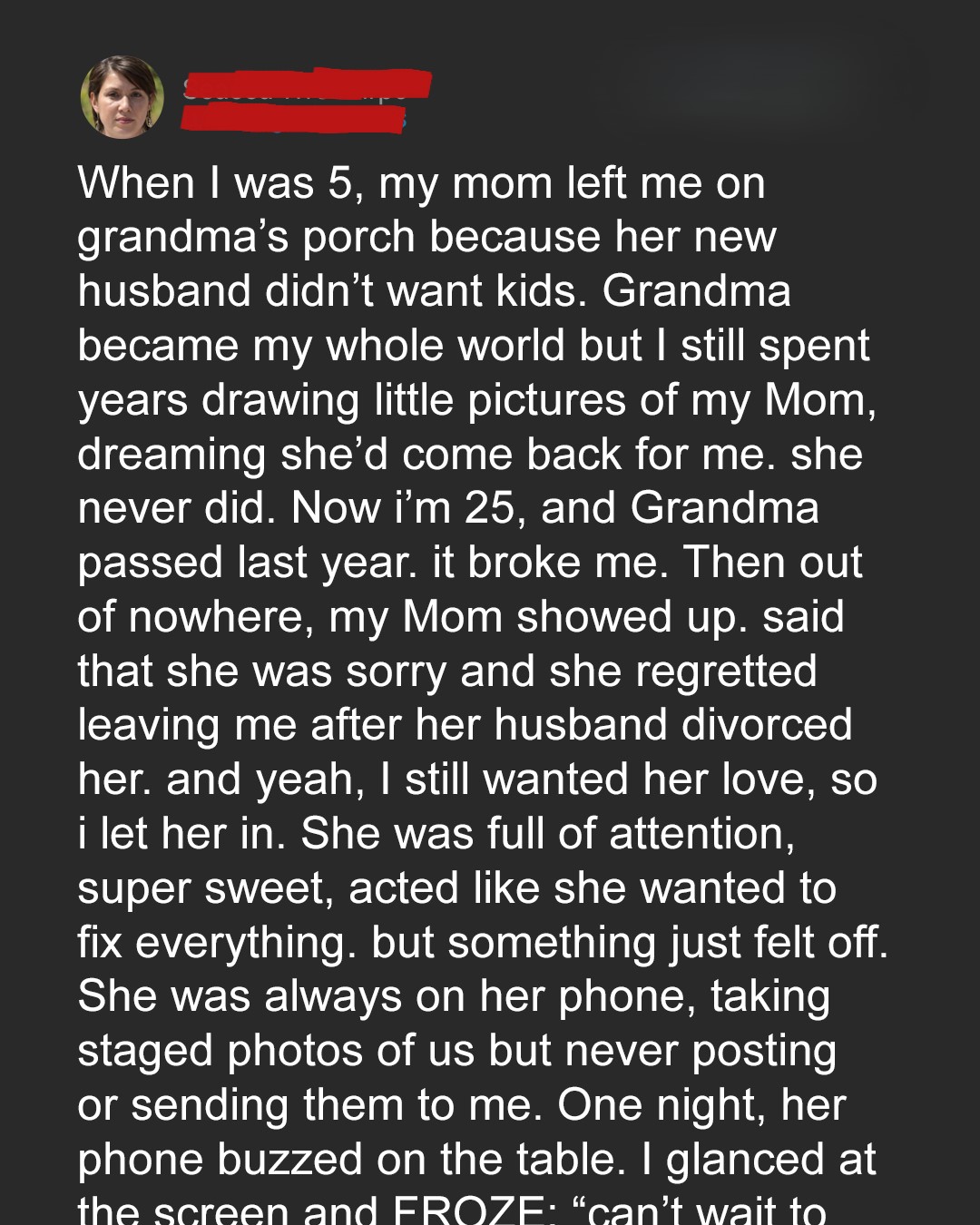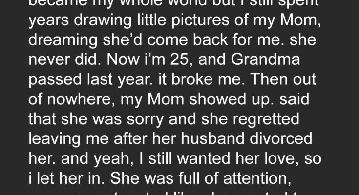 “Sweetie, Mark doesn’t want children in his new home,” Mom said, her voice wobbling. “But I love you very much. This is just… the best thing for everyone right now.”I didn’t understand much at the time. Mark, her new husband, had come into the picture after my own dad passed away a few years before. He never liked me. Even as a child, I could tell. But I couldn’t understand why we were at my grandmother’s (Dad’s mom) porch.
