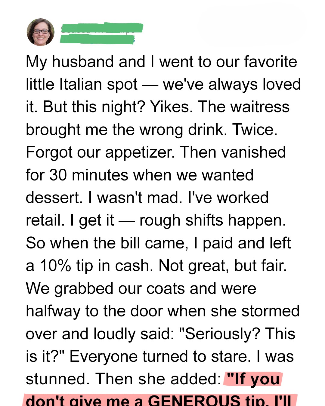 “Also, I don’t know how your husband lives with someone like you. If you don’t give me a GENEROUS tip, I’ll tell everyone here how greedy you are.”