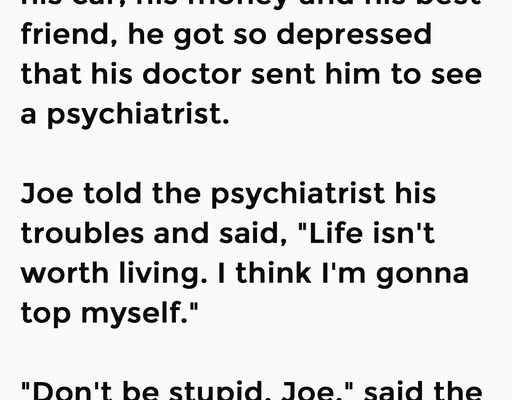 When Joe’s wife ran away with his car, his money and his best friend, he got so depressed that his doctor sent him to see a psychiatrist. Joe told the psychiatrist his troubles and said, “Life isn’t worth living. I think I’m gonna top myself.”