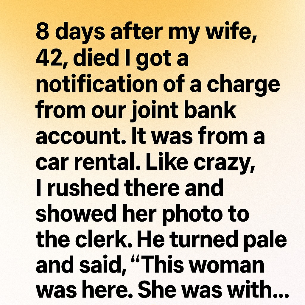 The notification came quietly, the way ordinary things do, and that was what made it unbearable. Eight days had passed since the funeral, eight days of learning how silence could have weight. When the charge appeared from the joint bank account—a car rental, of all things—it felt like a hand reaching out from a sealed room.