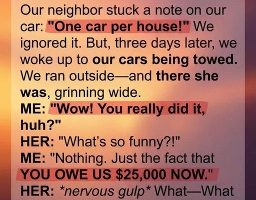 The driver calmly explained that a complaint had been filed, claiming our cars were illegally parked and needed removal. Before we could process the absurdity, I noticed our neighbor across the street standing on her porch, arms crossed, wearing a satisfied smile. It was the same woman whose handwriting matched the note.