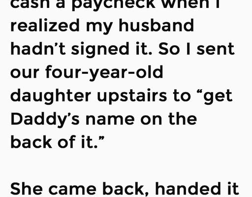 I was preparing to go cash a paycheckwhen I realized my husband hadn’t signed it. So I sent our four-year-old daughter upstairs to “get Daddy’s name on the back of it.”She came back, handed it to me, and said, “I knew his name so I did it myself.”