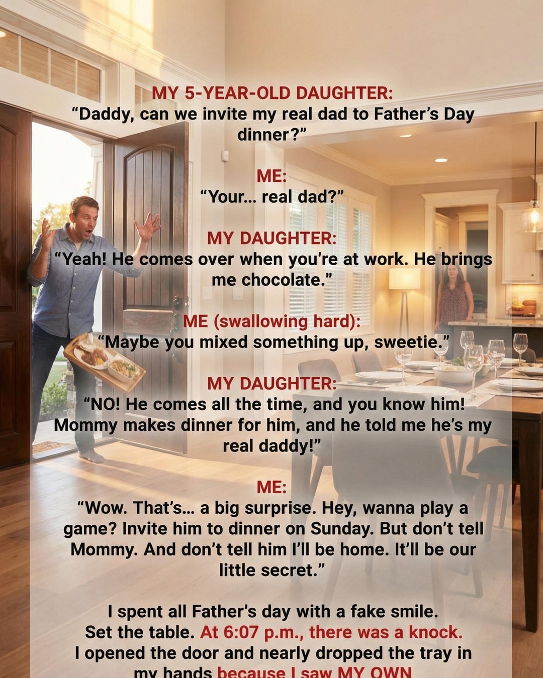 I spent all Father’s Day with a fake smile. Set the table. At 6:07 p.m., there was a knock.My wife walked in from the kitchen, wiping her hands on a towel, and immediately realized something serious was happening. I gently explained what our daughter had said. She gasped and turned pink with embarrassment.