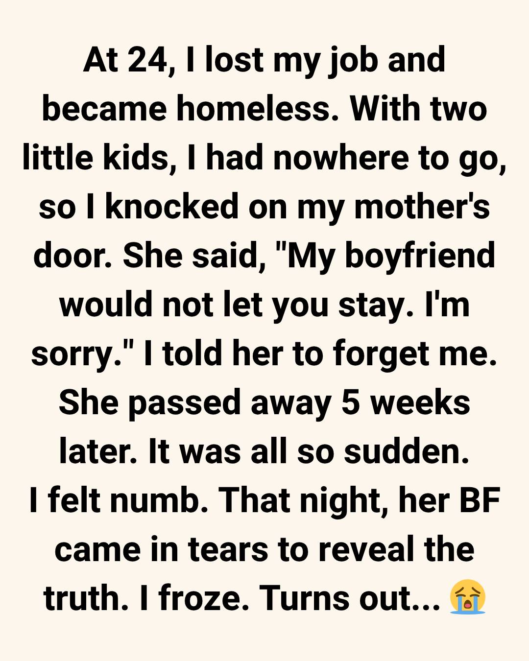At 24, I lost my job and became homeless. With two little kids, I had nowhere to go, so I swallowed my pride and knocked on my mother’s door. She opened it, looking thinner than I remembered, her eyes tired but still gentle.