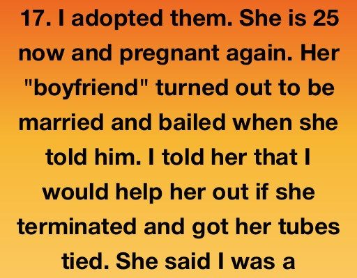 My little sister had her first kid at 15 and her second at 17. I adopted them. She is 25 now and pregnant again.Her “boyfriend” turned out to be married and bailed when she told him. I told her that I would help her out if she terminated and got her tubes tied. She said I was a monster and then proceeded to block my number, delete me on social media, and tell our extended family that I was trying to force her into a medical procedure.