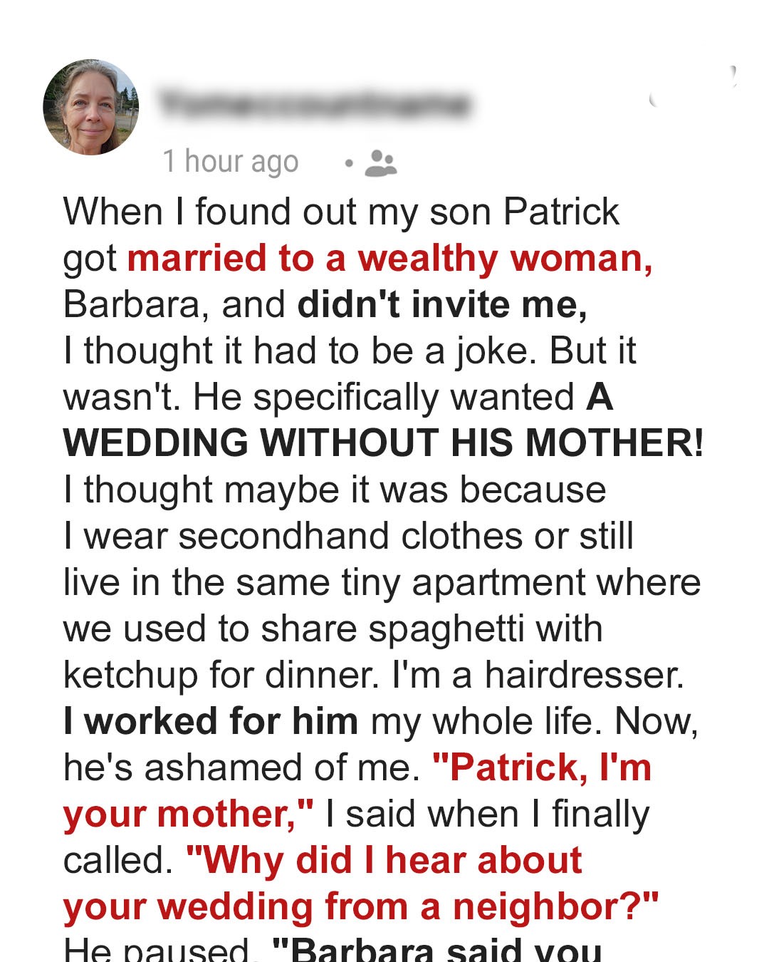 She showed me her phone. There was my son in a blue tuxedo, beside a woman in flowing white silk. Behind them, hundreds of guests in designer clothes. Everyone was there. Everyone except me.
