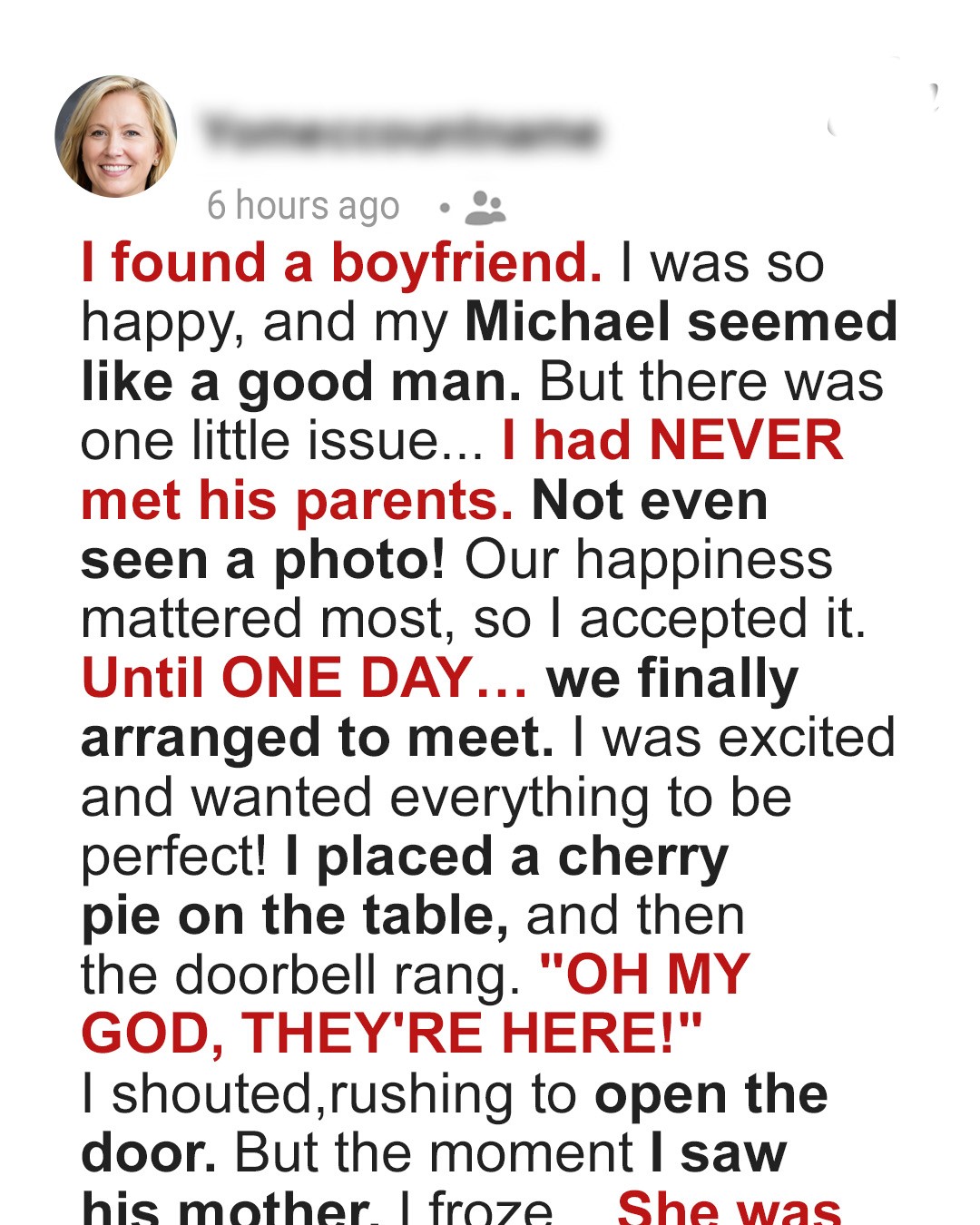Things between us were serious, we both knew this was the real thing. We had talked about the future, and it was clear we saw it together. Probably for life.Still, he refused to introduce me to his family. The only relative of his I had ever met was his cousin Josh and that only happened because we ran into him on the street.It was strange, because everyone in his family clearly knew about me. They even sent us joint holiday cards. And yet Michael kept putting off any actual introductions.