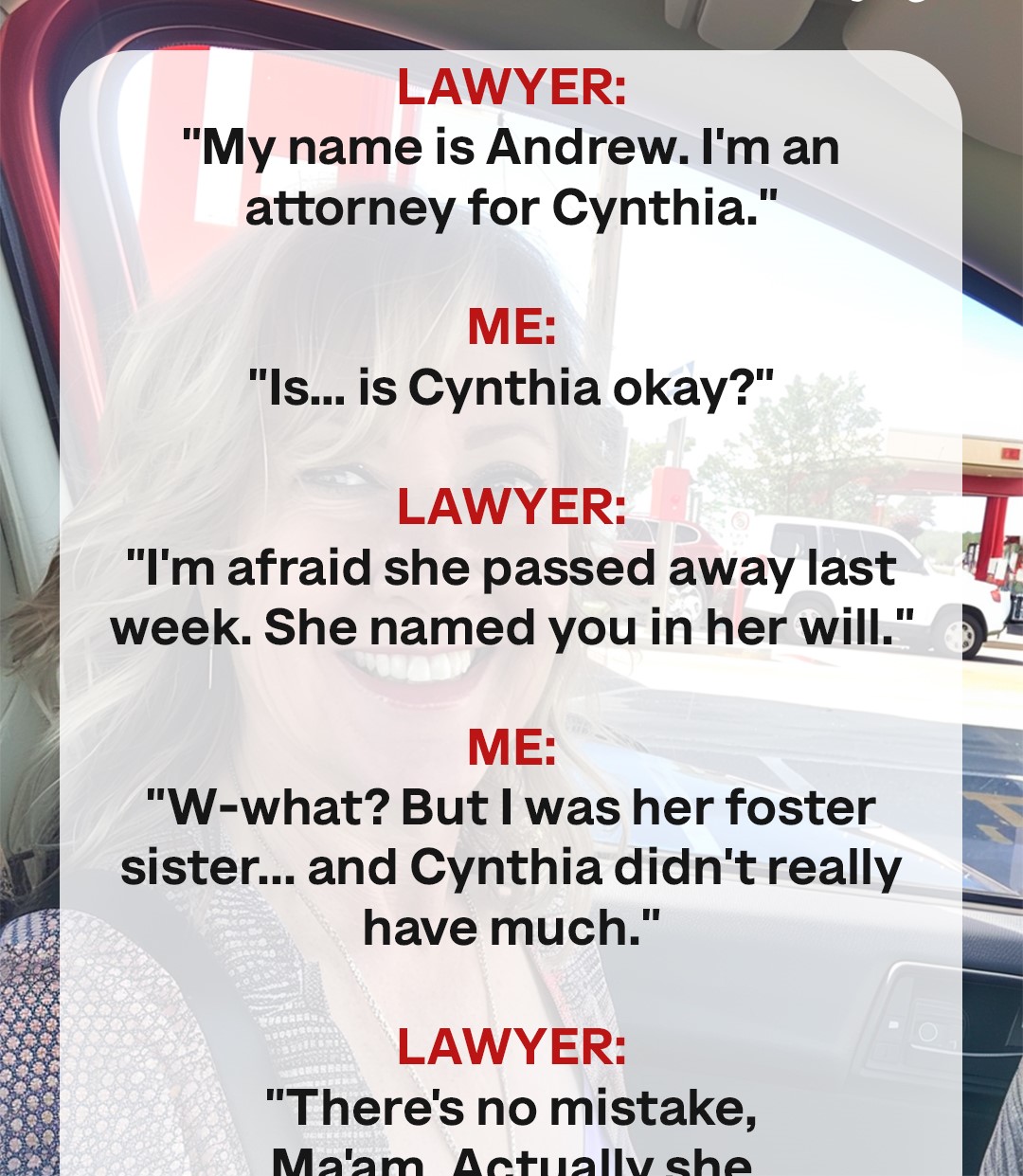 “I’m afraid she passed away last week. She named you in her will. I’ll need you to come in for the reading.”