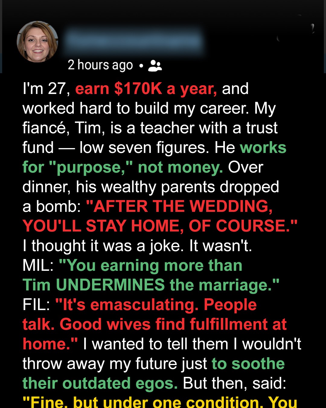 My fiancé’s wealthy parents wanted a picture-perfect daughter-in-law who stayed home, cooked, and cleaned. They believed me earning more than their golden son hurt his manliness. So they asked me to quit my job after marriage. I agreed, but with one condition that left them gasping.I’m Abbie. At 27, I make $170K a year in a job I love.