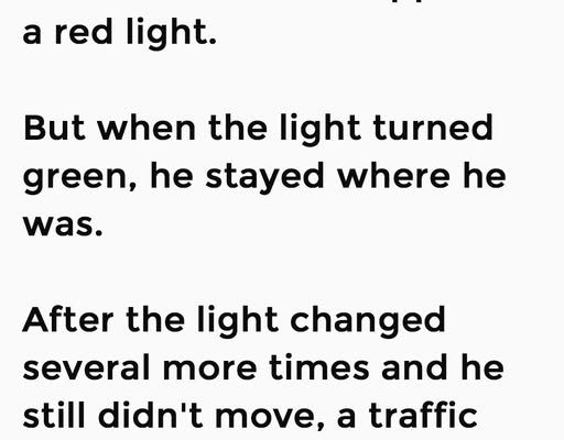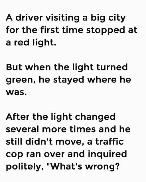 A driver visiting a big city for the first time stopped at a red light. But when the light turned green, he stayed where he was. After the light changed several more times and he still didn’t move, a traffic cop ran over and inquired politely, “What’s wrong?