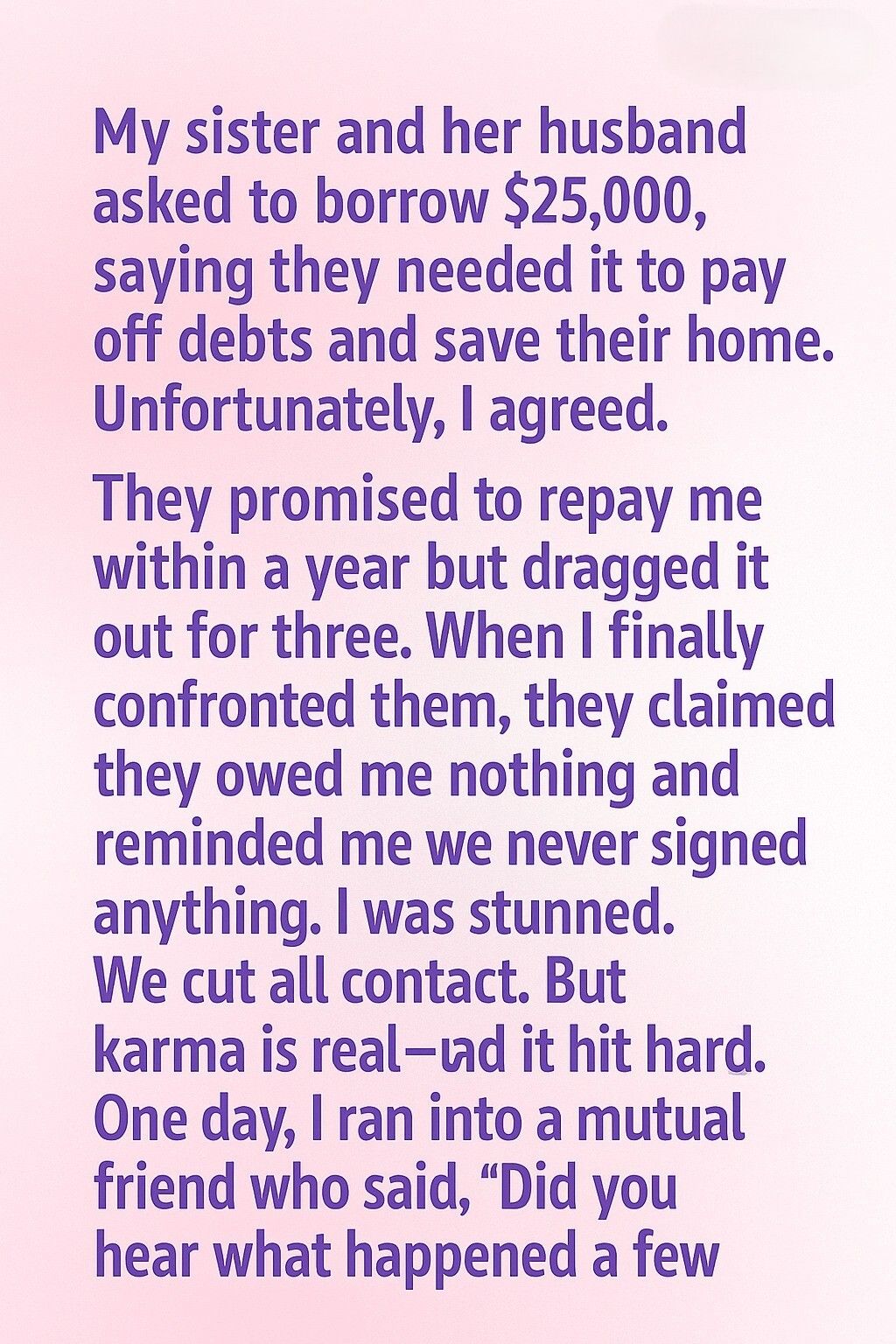 When my sister and her husband first asked to borrow money, I believed every word that came out of their mouths. They spoke of overdue bills, unexpected emergencies, and the fear of losing their home. Wanting to help family, I handed them $25,000 without a second thought.