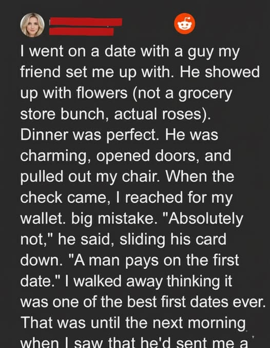 When he insisted on paying for our first date, I genuinely thought I had met one of those rare, old-fashioned gentlemen people always talk about but rarely encounter. He brought roses, gave me a thoughtful gift, listened attentively, and carried himself with an effortless charm that made the evening feel almost cinematic. I went home smiling, convinced I had just experienced one of the best first dates of my life.