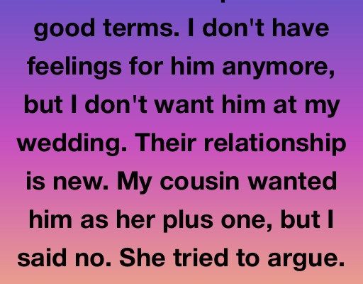 My cousin is dating my ex, whom I broke up with on good terms. I don’t have feelings for him anymore, but I don’t want him at my wedding. Their relationship is new.My cousin wanted him as her plus one, but I said no. She tried to argue. Feeling frustrated, I finally told her, ‘You can come alone or not come at all.