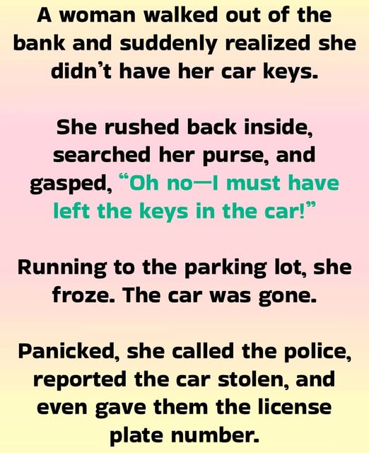 Panicked, she called the police, reported the car stolen, and even gave them the license plate number. Then came the hardest call of her life… to her husband. Stammering, she said, “Honey, the car’s been stolen.