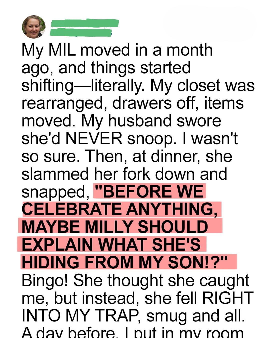 But what could I do? I couldn’t accuse her without proof. And I couldn’t put a camera in the bedroom. Mark would never agree. And honestly, I didn’t want to be the woman who installed spy cams to catch her MIL.