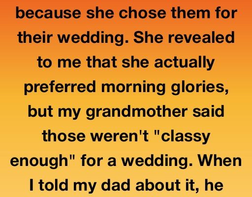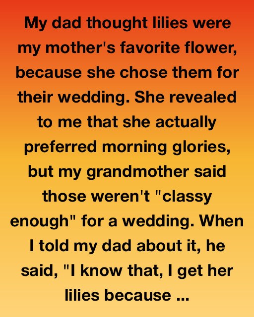 My dad thought lilies were my mother’s favorite flower, because she chose them for their wedding. She revealed to me that she actually preferred morning glories, but my grandmother said those weren’t “classy enough” for a wedding. When I told my dad about it, he said, “I know that, I get her lilies because they remind her of the day she smiled so hard, her face hurt for a week.”