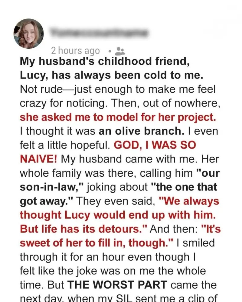 Lucy said nothing, just snapped pictures, while Jason fidgeted but stayed silent.I felt invisible—like a placeholder in a play where I didn’t belong. The following morning, Jason’s sister Madeline sent me a screen recording of Lucy’s private Instagram story. In it, I posed awkwardly while Lucy and her family laughed.