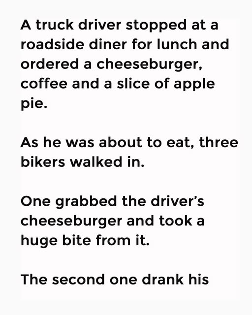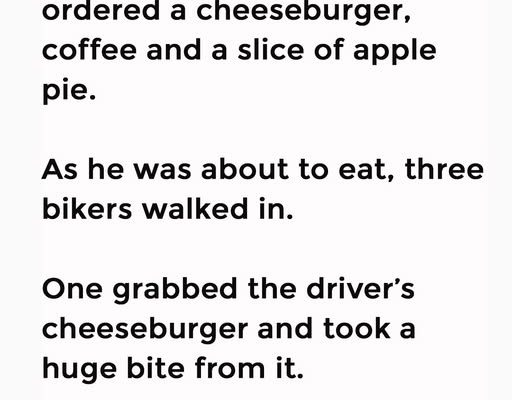 A truck driver stopped at a roadside diner for lunch and ordered a cheeseburger, coffee and a slice of apple pie. As he was about to eat, three bikers walked in. One grabbed the driver’s cheeseburger and took a huge bite from it.